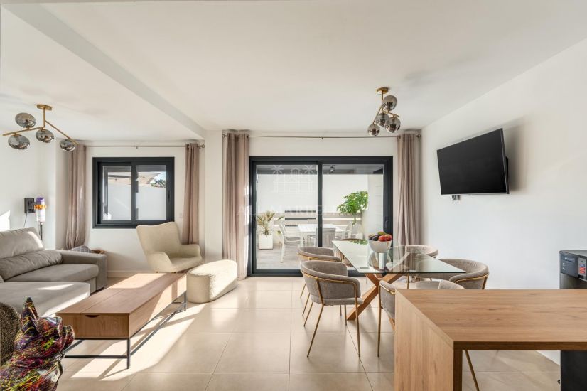 Wonderful three-bedroom townhouse located in the gated community of Agra Residencial. This elegant home forms part of a boutique development of just 47 spacious properties situated next to El Campanario Golf & Country Club, in the heart of Estepona’s sought-after Golden Triangle. Ready to move into, it offers bright open-plan interiors with high-quality finishes, including ceramic flooring, fitted wardrobes, modern bathrooms with glass shower screens, and a fully equipped kitchen. The lower level provides excellent storage space, a laundry room, and a versatile multipurpose area ideal for a home cinema, gym, or games room. Designed for effortless, contemporary living, the property features generous terraces, a private solarium, hot and cold air conditioning, and two underground parking spaces. Residents also enjoy beautifully landscaped communal gardens and a serene swimming pool, all within a secure and tranquil environment.